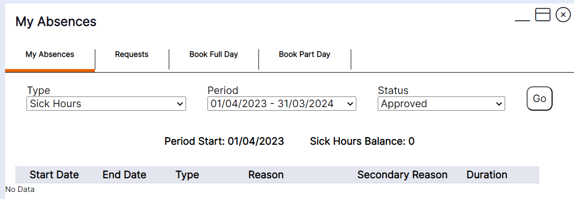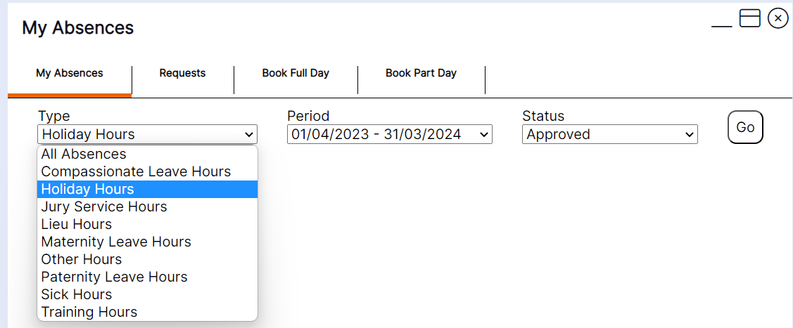 Step 3- Select "My Absences" then from the drop down menu enter the "Type", "Period" and "Status" then select "Go".