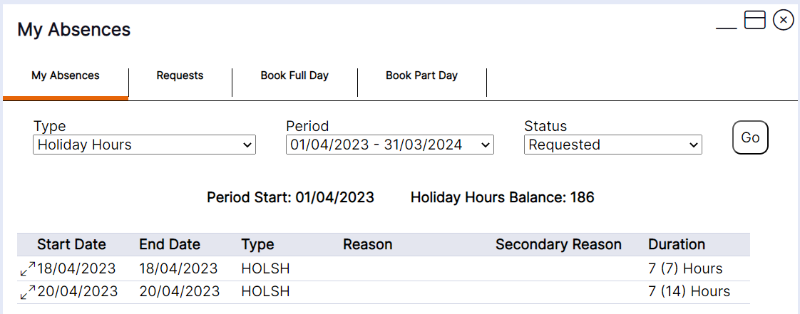 HANDY HINT - The balance that displays from this view, will have any requests for absence that you have made, that your line manager has not yet approved already subtracted. This is to prevent you booking more leave than your available balance allows. To view any outstanding requests that are not yet approved, you can update the status drop-down to requested and press Go again, and the system will display these for you. The balance will also have any requests you have made to carry forward leave from this leave period (leave year) that have either been approved or not yet approved, subtracted. This is also to avoid you booking more leave than your available balance allows.