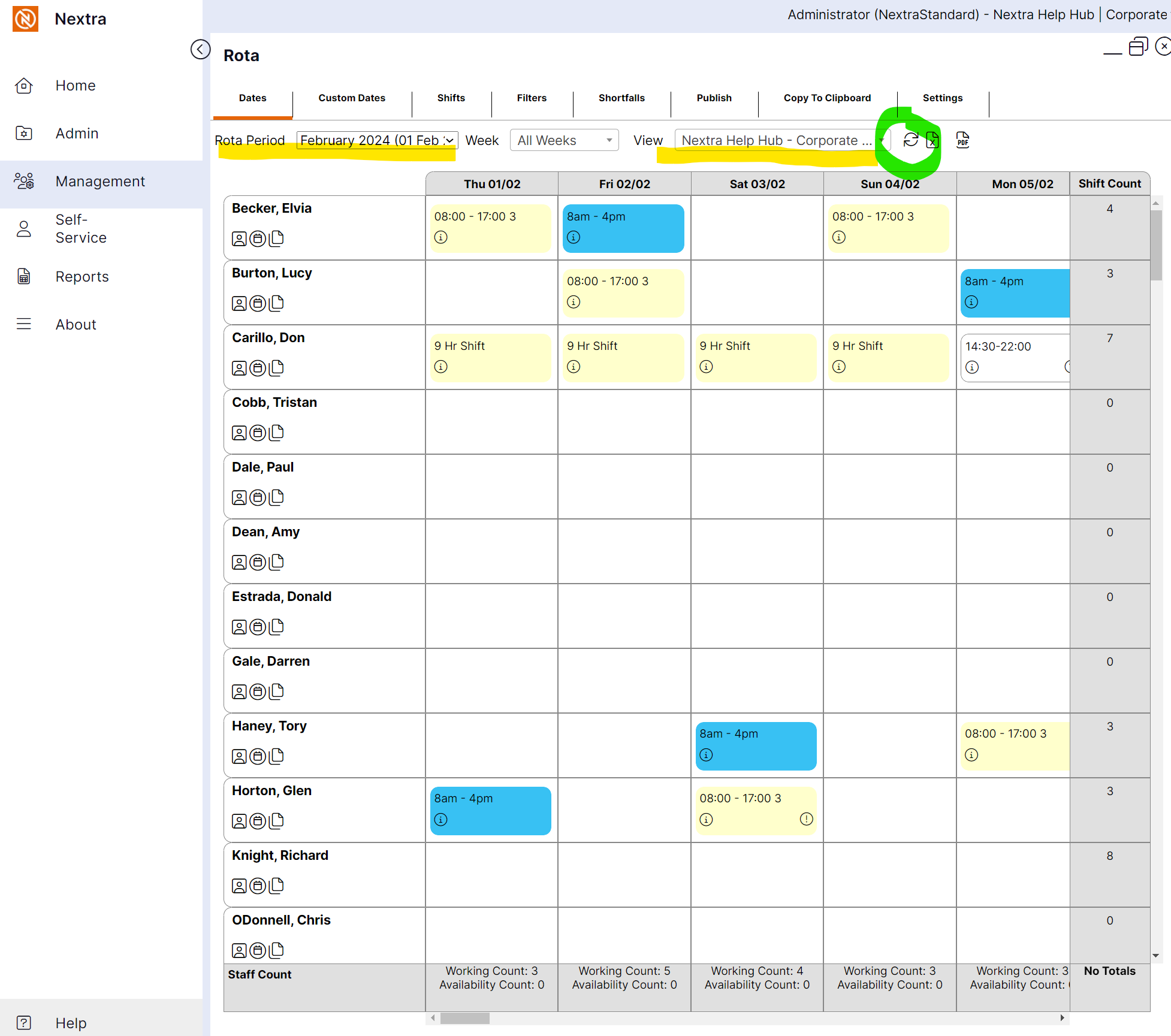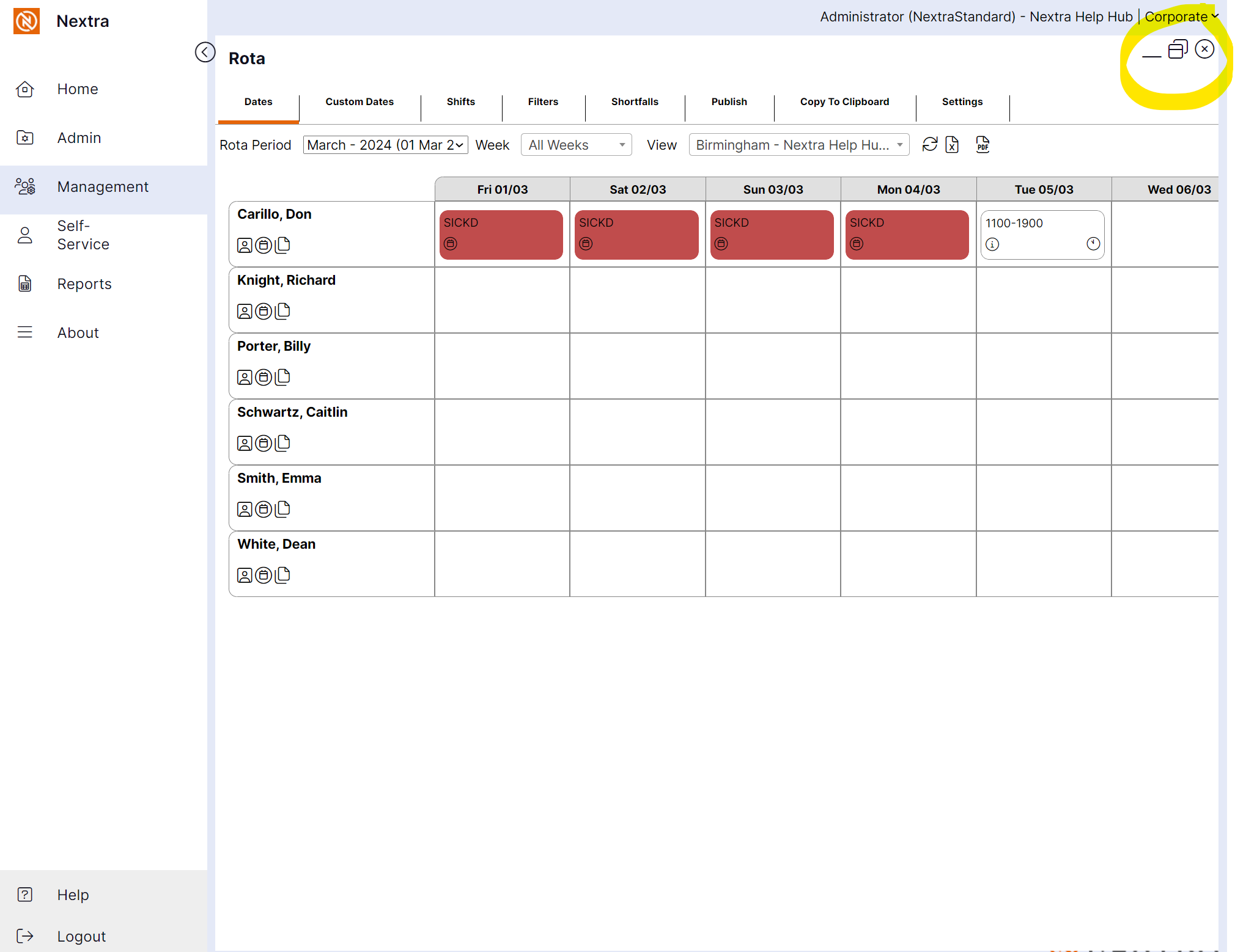 To close the rota, click the X icon to close or _ to minimize. Use the side menu to return to Admin and Management tasks.