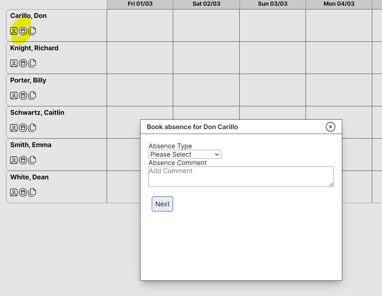 A table of employees and roster details are displayed. Find the relevant team member and click on the Book absence icon next to their name, the book absence screen is displayed