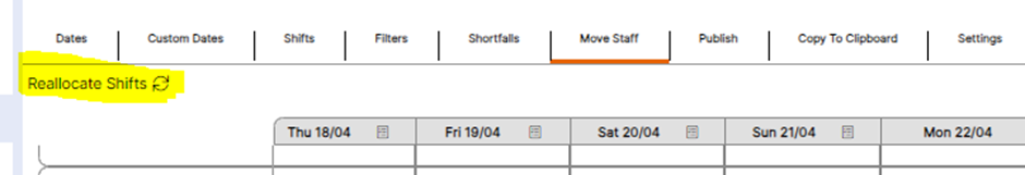 Highlight the cells of all the shifts of the staff members that you wish to move to another day session. Once chosen, the shifts will turn grey (as shown below)