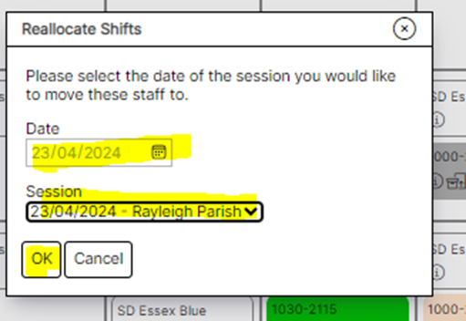 and the user will be presented with the following pop-up box, populate with a target date for shifts and select the session offered, click okay.